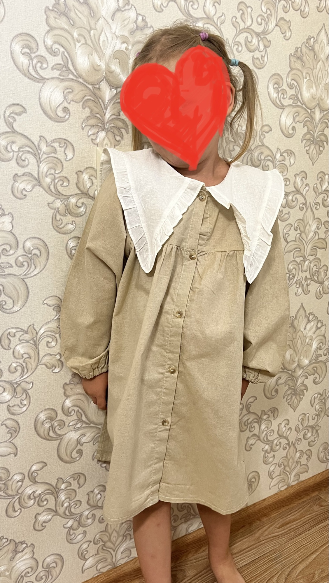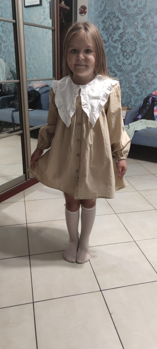 The dress is beautiful, thin. Fast delivery. For height 114 cm took 130 size. A little with a margin of work)