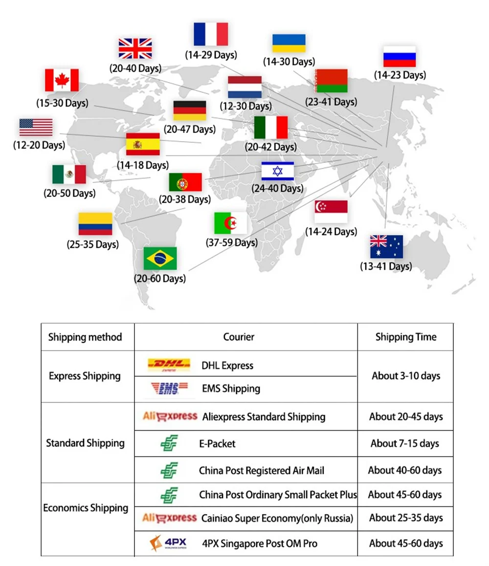 Packages from our warehouse in China will be shipped by ePacket or EMS depending on the weight and size of the product. Packages shipped from our US warehouse are shipped through USPS.