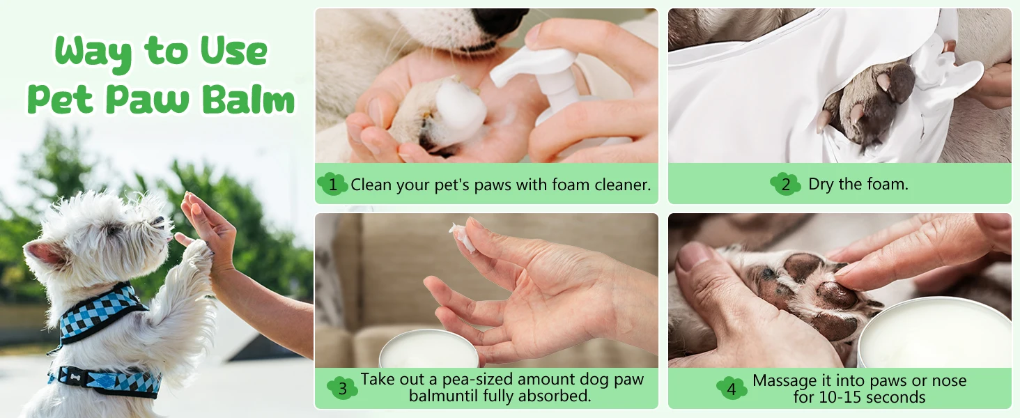 Simply warm a pea-sized amount dog paw balm between your fingers and m