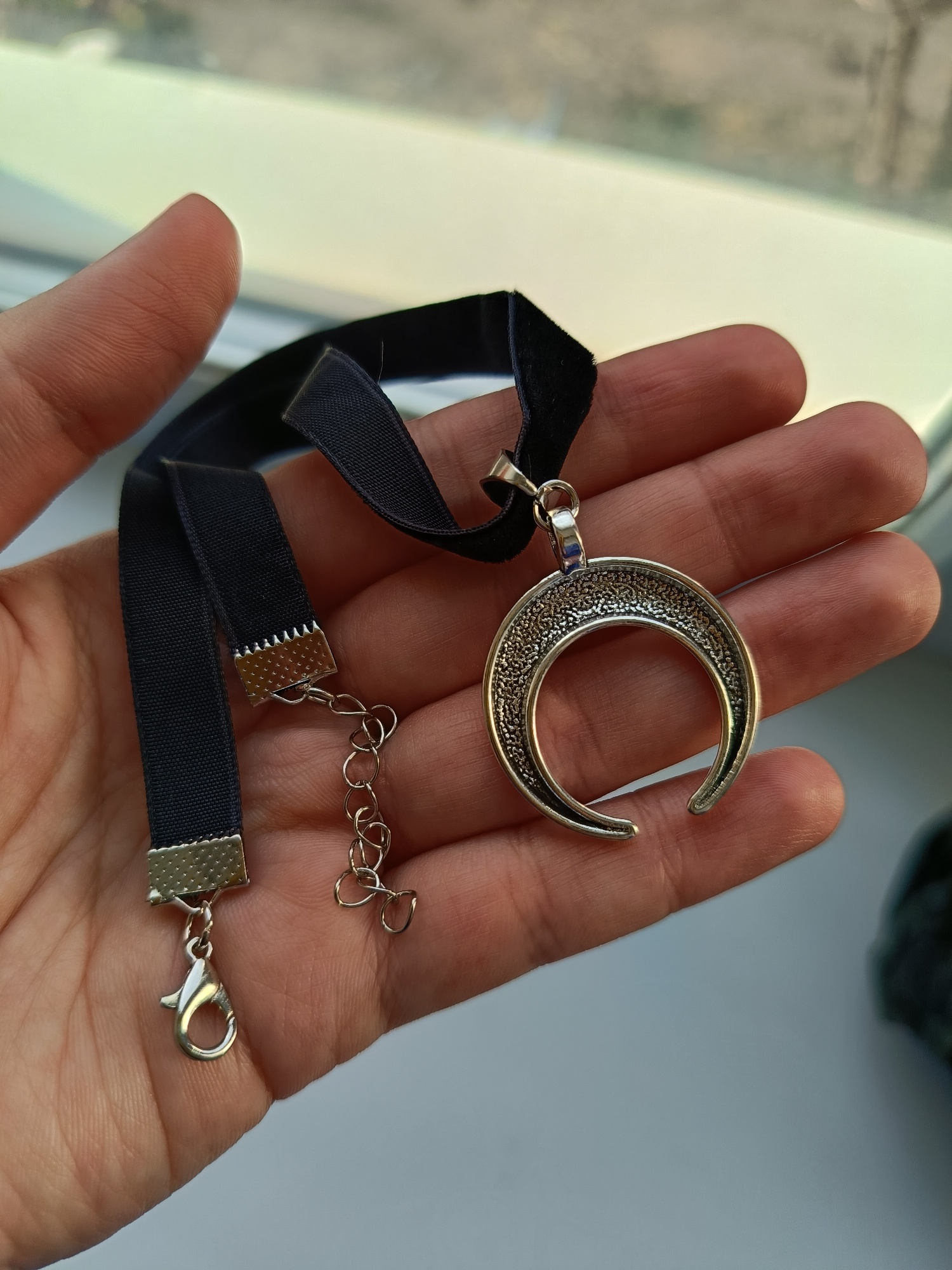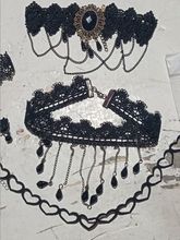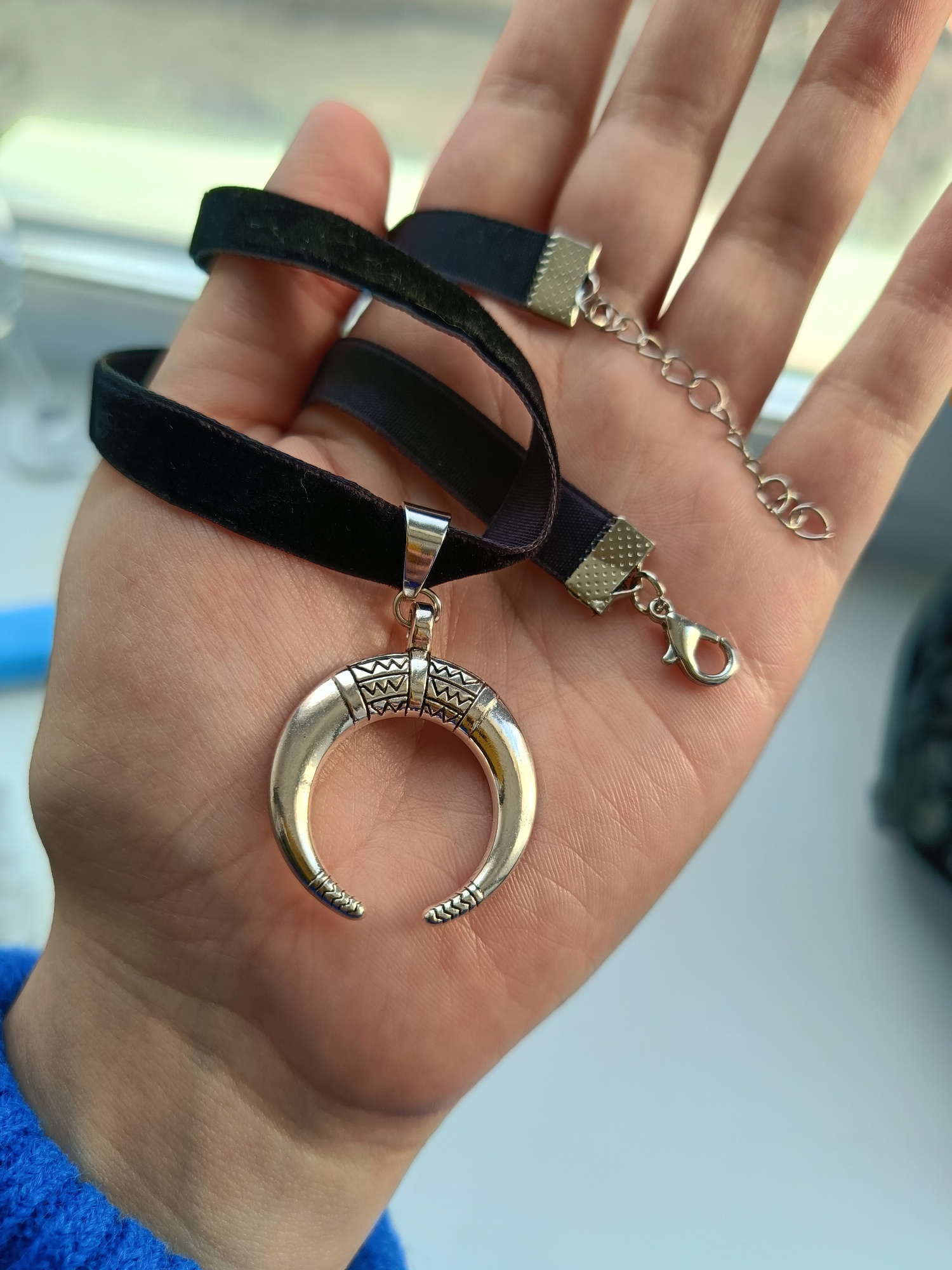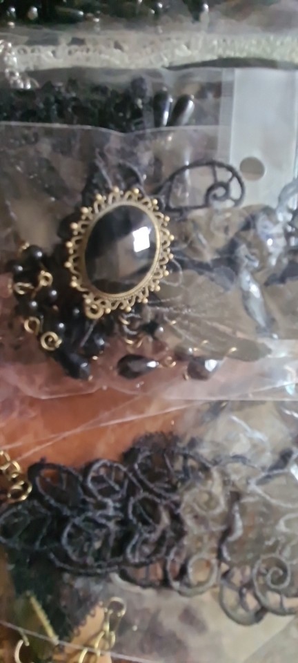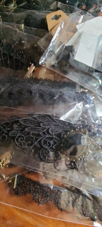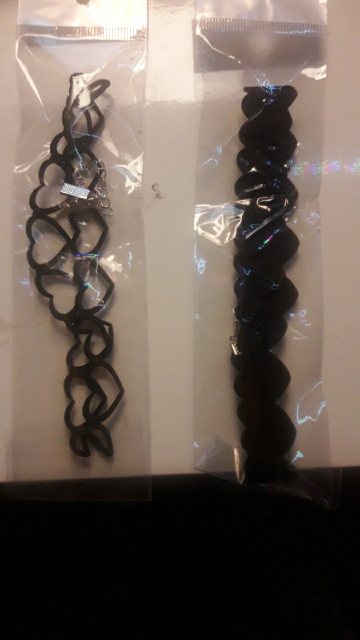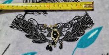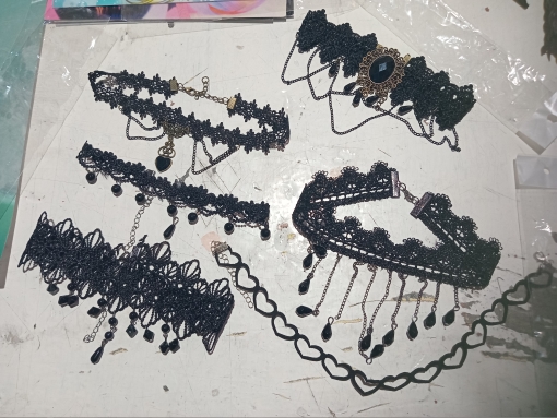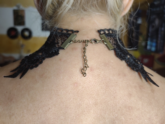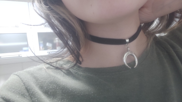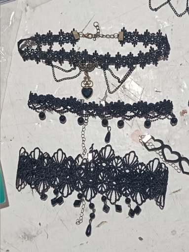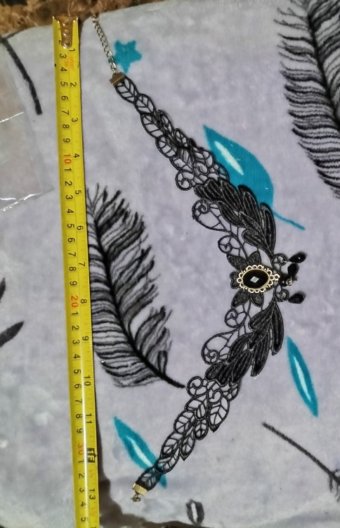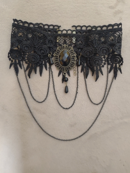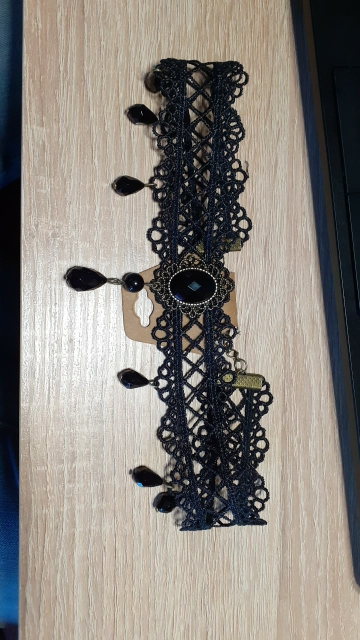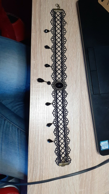 Super Choker. Everything came in the whole in the bag. The sickle inside is full. Thin velvet ribbon in one layer has a regulator of length, but not very large. Bought earrings, very satisfied