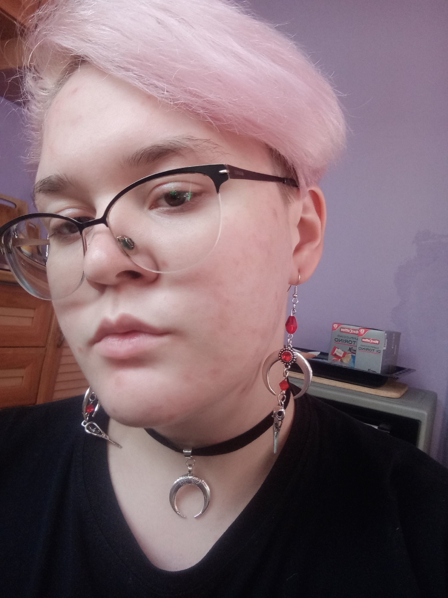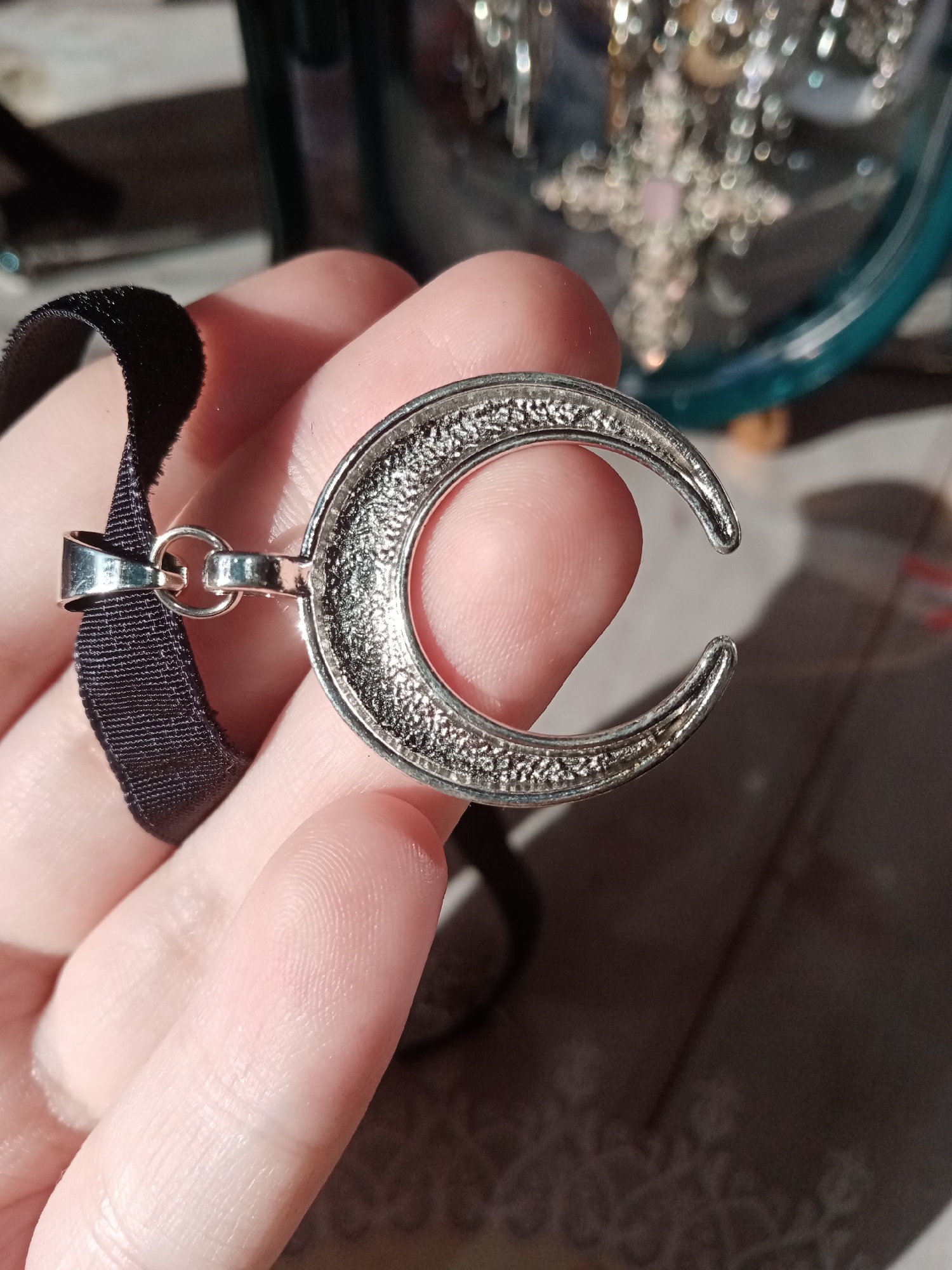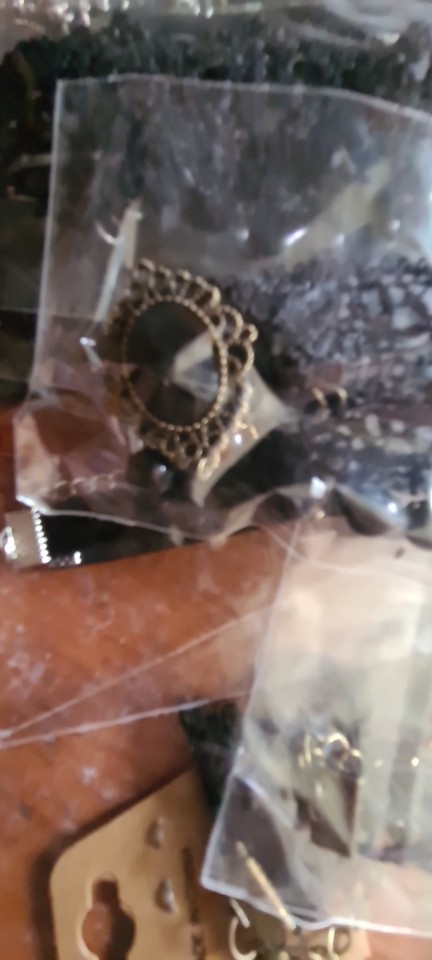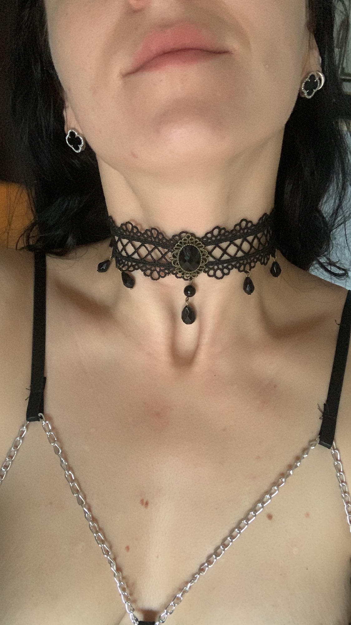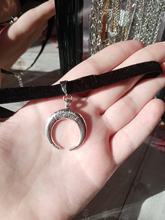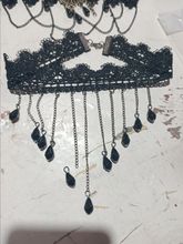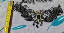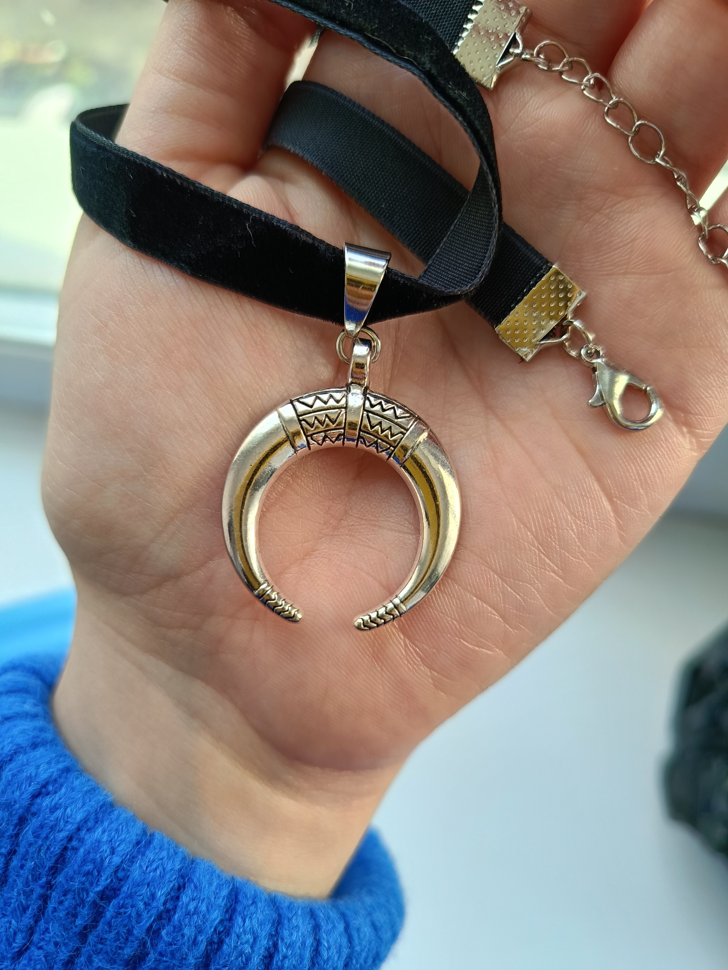 Super Choker. Everything came in the whole in the bag. The sickle inside is full. Thin velvet ribbon in one layer has a regulator of length, but not very large. Bought earrings, very satisfied