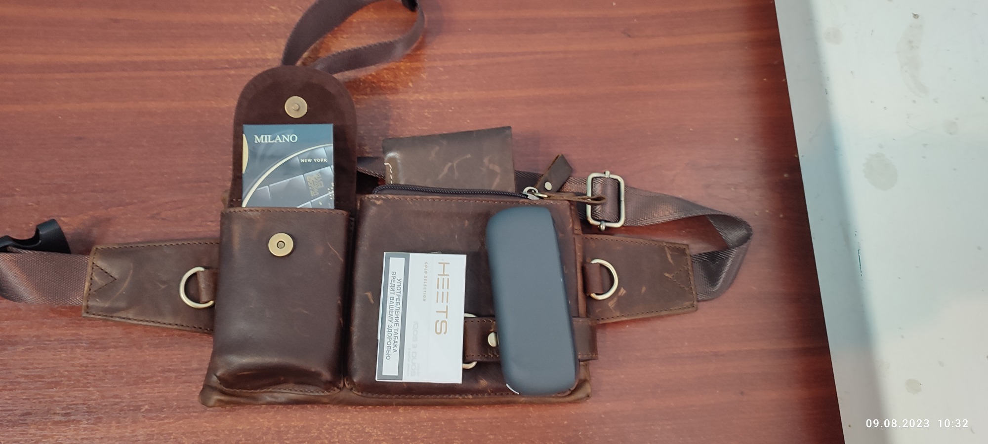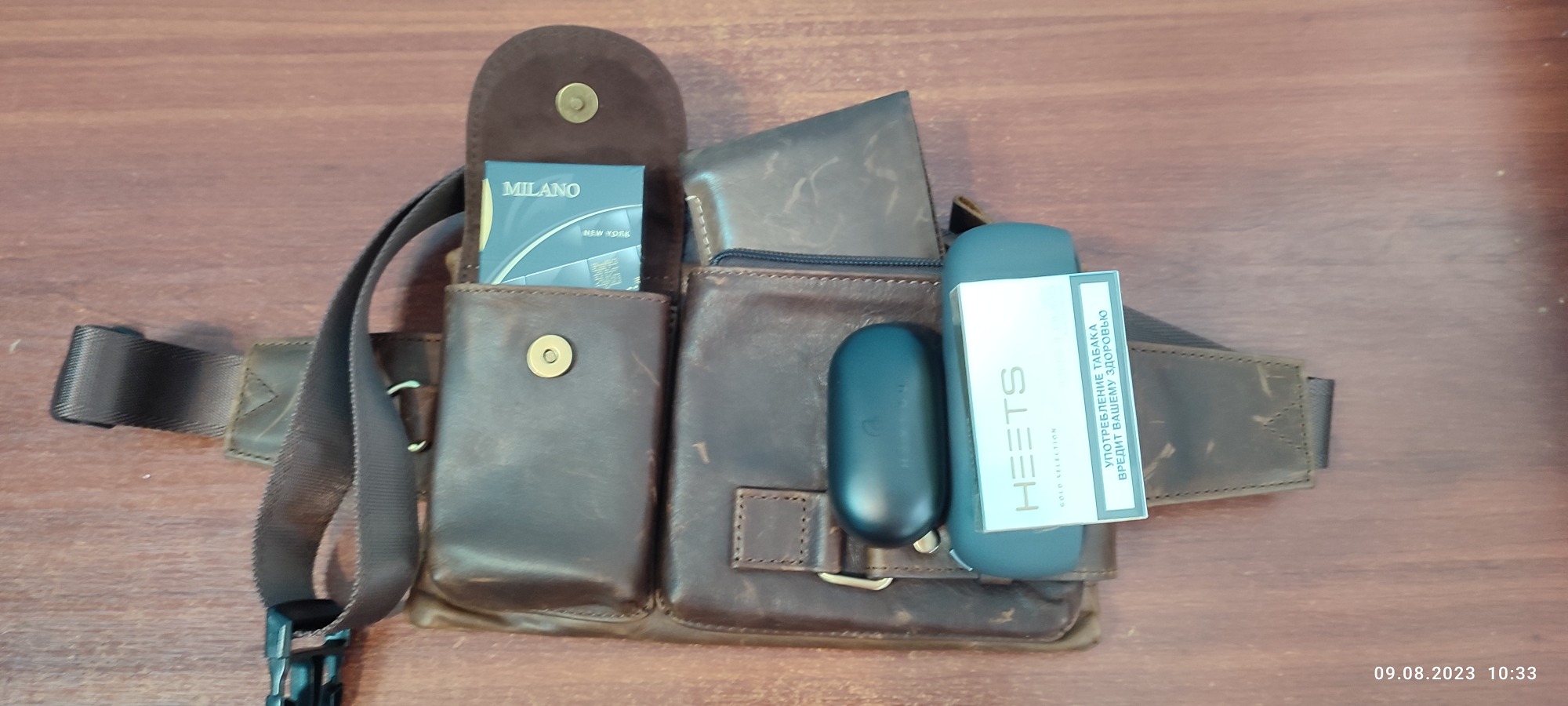 I arrived from the Russian government very quickly. Exactly the skin. Thought it would be less, but got what he wanted. I could not find the size of the store, I will measure it myself. Bag 225x135x30, pocket with zipper 130x115x15, pocket with valve 125x70x20 (dimensions in mm). Fit all the simple men's scarcity: a smartphone, a wallet, wireless ears, a pack of cigarettes, a lighter or iquos and a pack of stickers, Keys. So the pockets are almost free, everything is stylish and cute. Came with an old backpack.