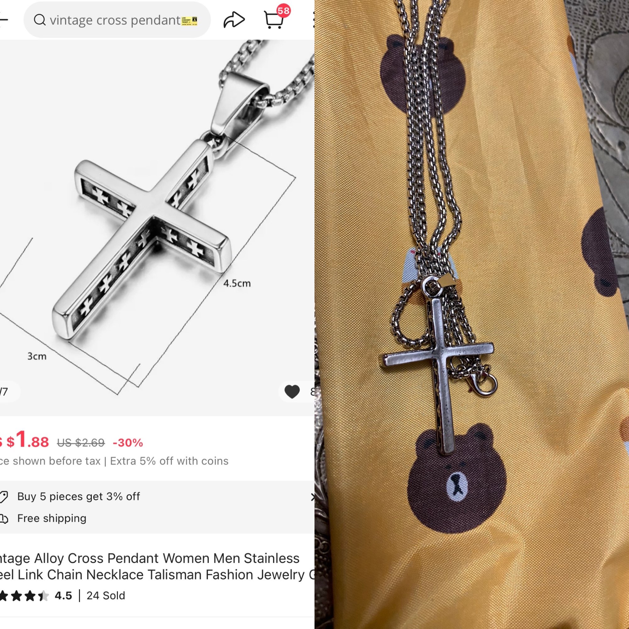 I ordered several same chains but with different crosses. This one looks exactly as on the store’s photo which was not the case with another cross pendant. The first photo shows the bad version and 2nd and 3rd shows this one that is good one.