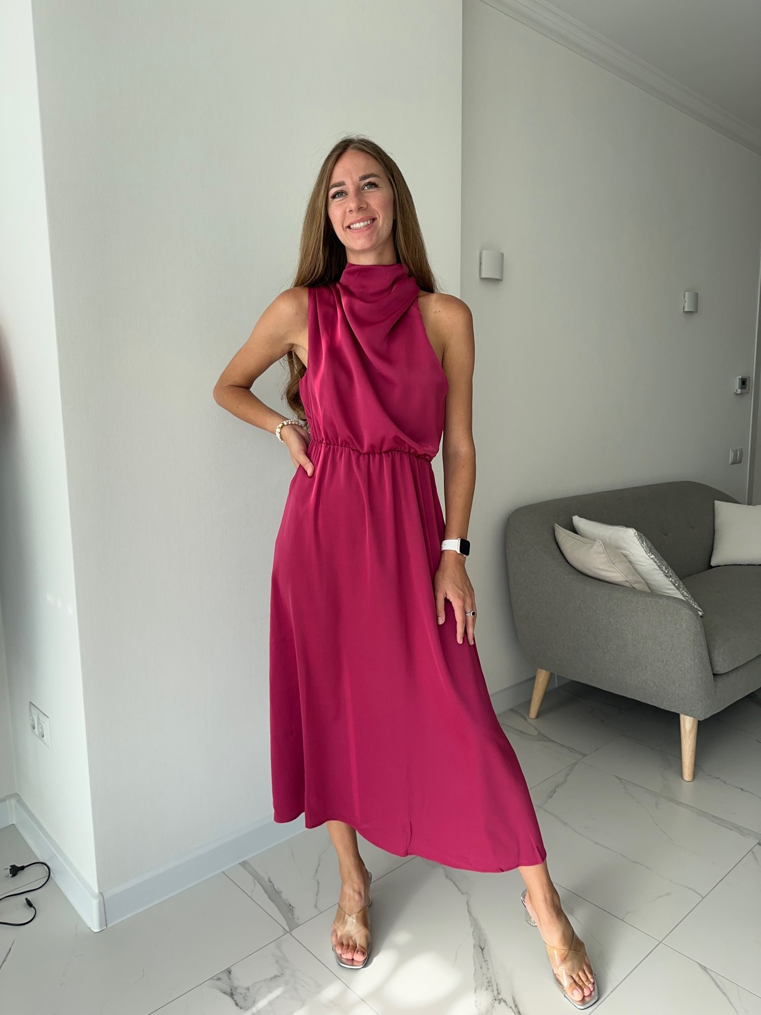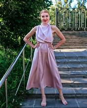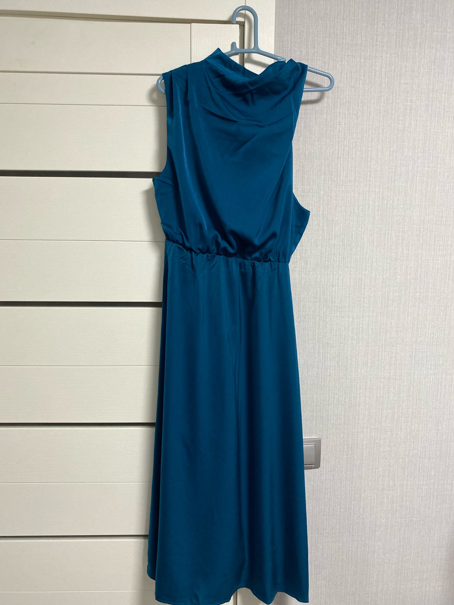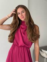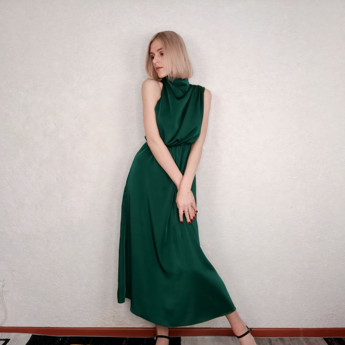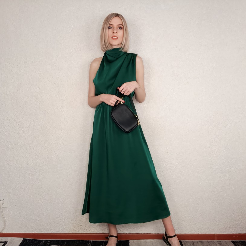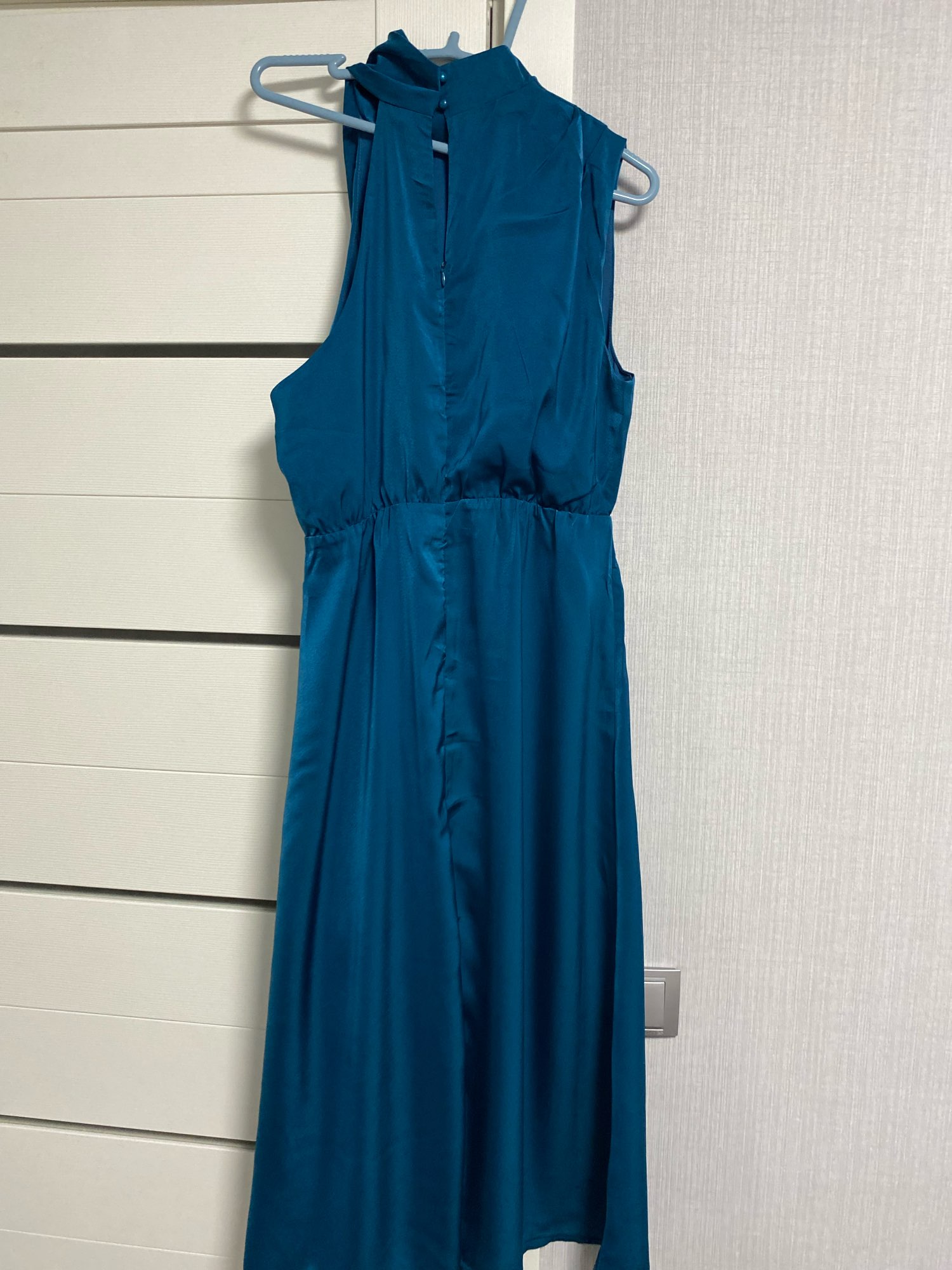 Graceful dress from Gy fashionistas. Holidays and various kinds of gala evenings and special occasions, this is a great occasion to wear a beautiful dress. emphasizes the figure well, but at the same time hides flaws and pulls out the silhouette. A little asymmetry from above, to the waist. The belt is a sewn elastic band. the neck area is beautifully beaten, the collar is a stand, it has two buttons on the back. size S, for: height 172 cm, OG 90 cm, from 60 cm, about 90 cm. The village is ideal. 10 colors. chic satin material, very delicate, no fondness. recommend.