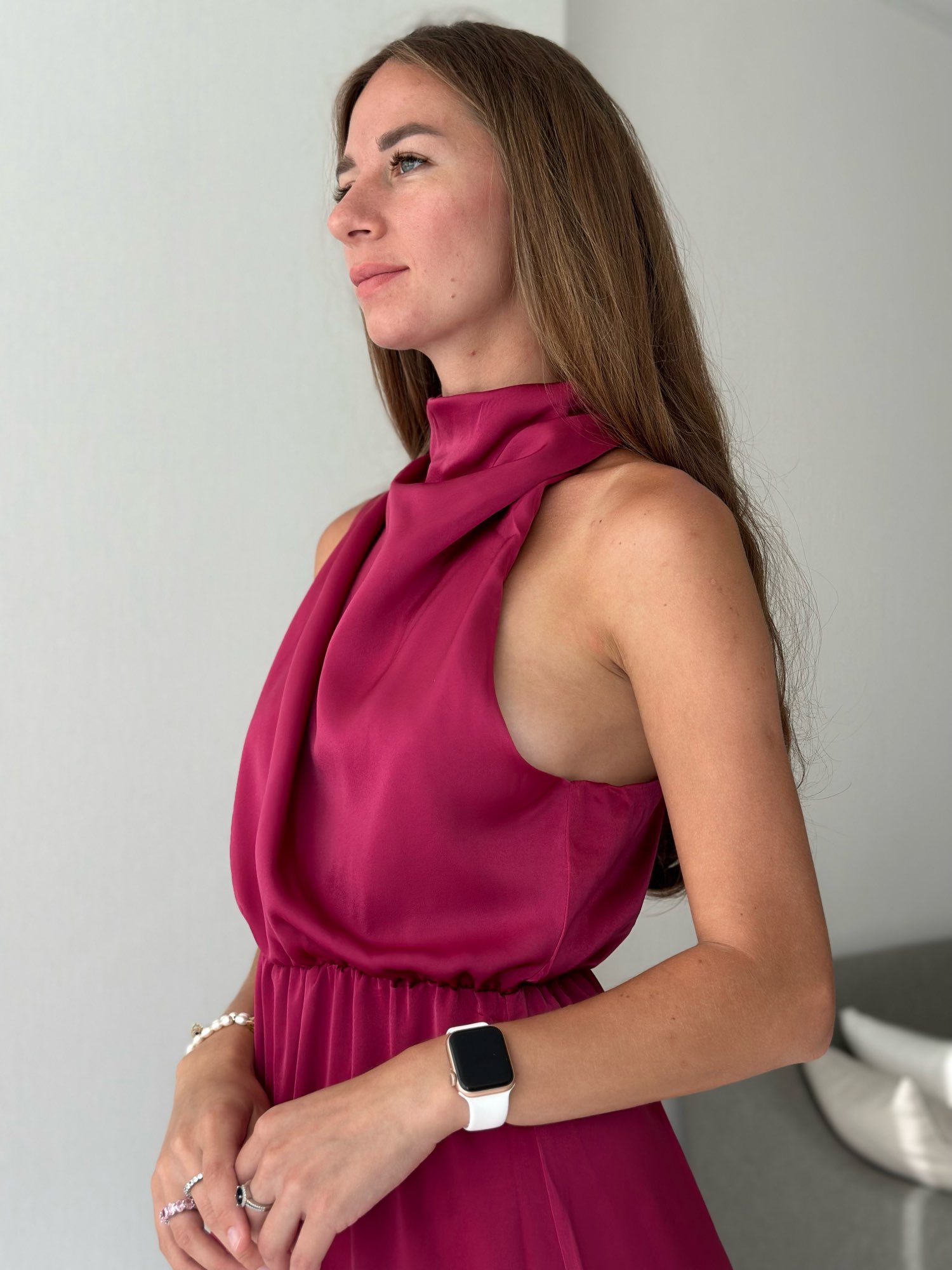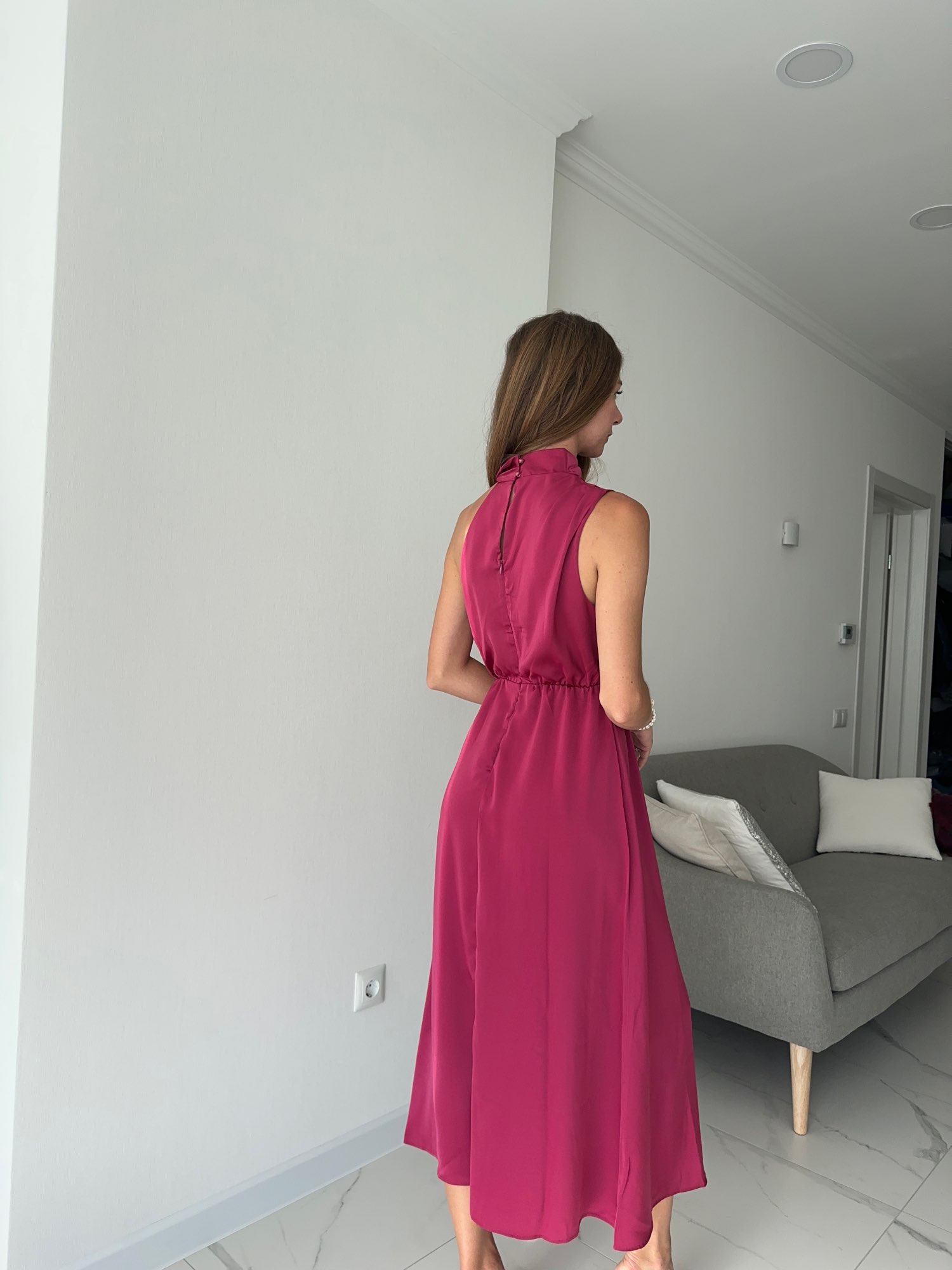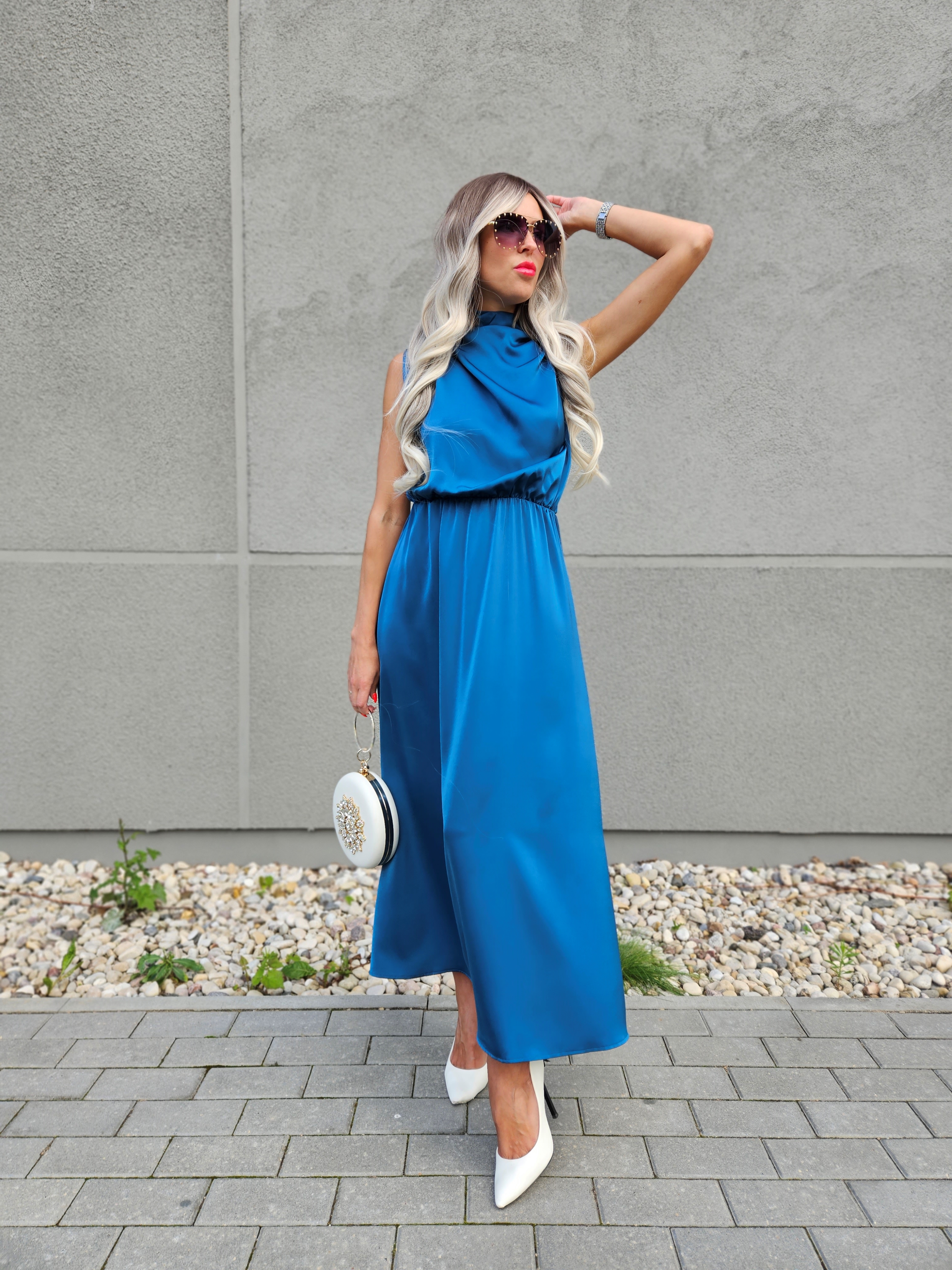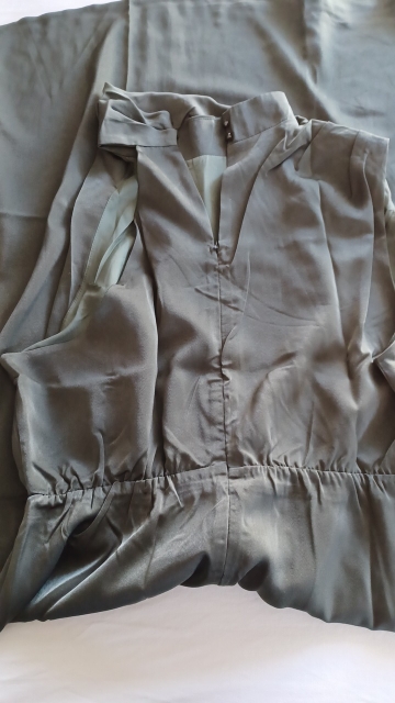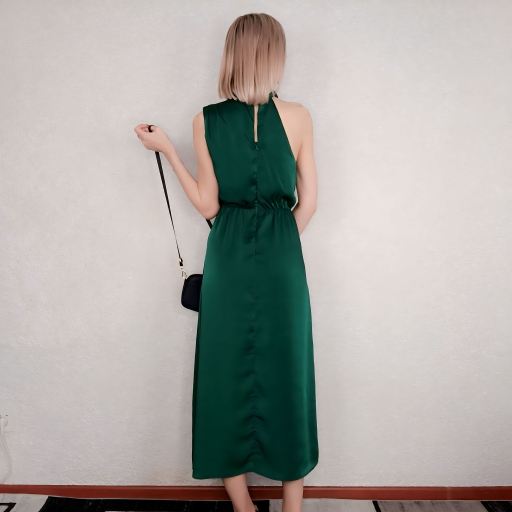 Graceful dress from Gy fashionistas. Holidays and various kinds of gala evenings and special occasions, this is a great occasion to wear a beautiful dress. emphasizes the figure well, but at the same time hides flaws and pulls out the silhouette. A little asymmetry from above, to the waist. The belt is a sewn elastic band. the neck area is beautifully beaten, the collar is a stand, it has two buttons on the back. size S, for: height 172 cm, OG 90 cm, from 60 cm, about 90 cm. The village is ideal. 10 colors. chic satin material, very delicate, no fondness. recommend.