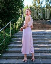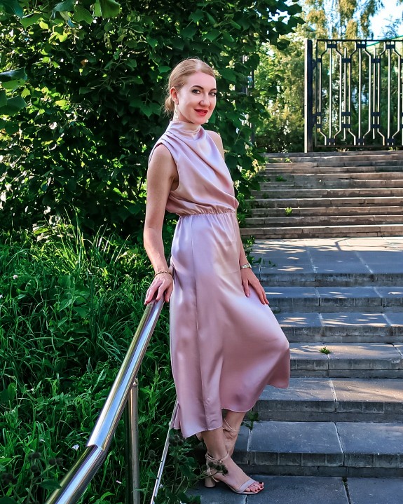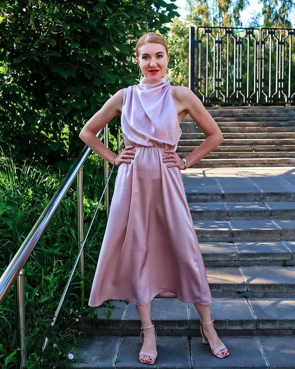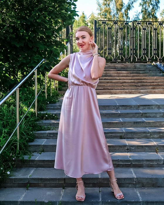 I liked the dress very much! It well emphasizes the advantages and hides flaws, drawing out the silhouette. Made of dense, flowing satin fabric. Back clasp with a secret zipper. Dowel stand with two buttons. Elastic waist. No lining. The dress has an optimal length of about 125 cm. For its parameters 85-67-92 and height 173 cm, I chose the size m. Village dress great.