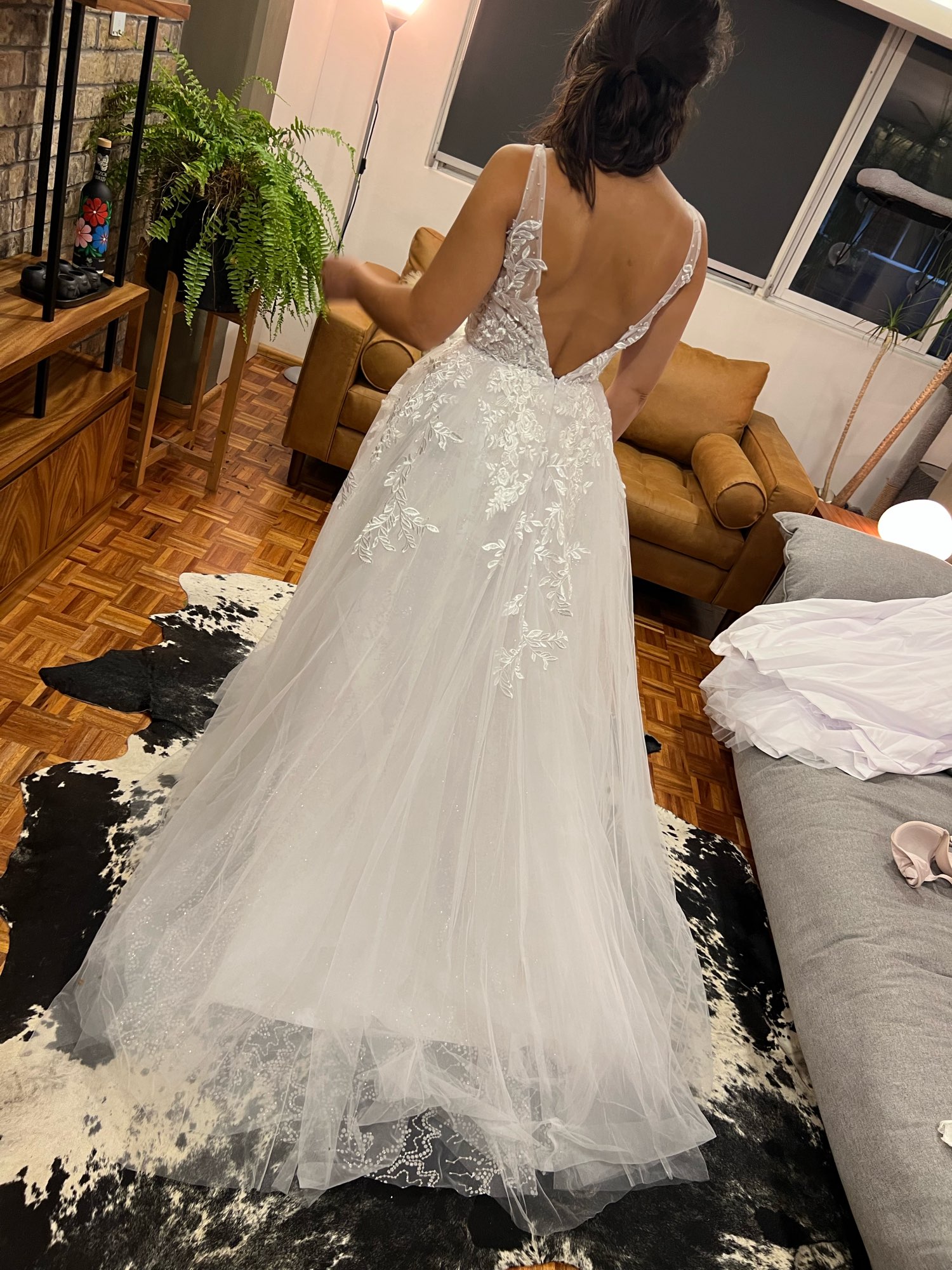 As it comes in the photos! The dress is beautiful and shines super beautiful, the details are beautiful, I am very happy with the purchase
