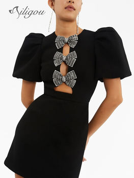 Black Sexy Short Sleeve Round Neck Bow Hollow Tight Mini Bandage Dress